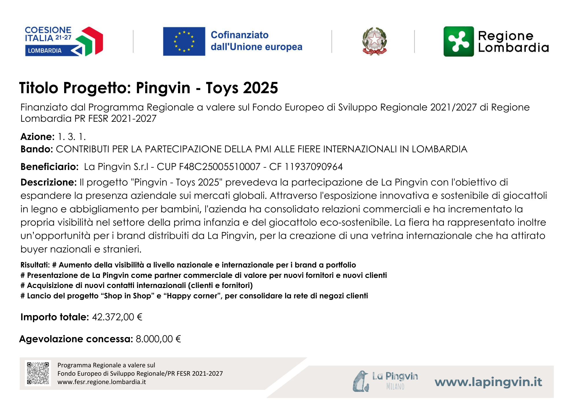 La Pingvin S.r.l ha ricevuto un contributo economico di € 8.000 di supporto alla partecipazione di questa fiera dal Programma Regionale lombardo del Fondo Europeo di Sviluppo Regionale/PR FESR 2021-2027 con il progetto “Pingvin – Toys 2025” : tale contributo era volto a consolidare il posizionamento delle MPMI sul mercato internazionale sostenendo la partecipazione alle manifestazioni fieristiche di livello internazionale che si svolgono in Lombardia,